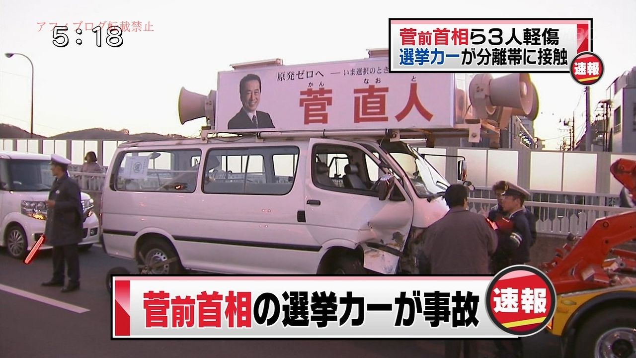 昨日、20分おきくらいに同じことを繰り返し話し、合計2時間以上はかけていた東小金井駅前での菅直人の演説の警備にあたっていたSPたちはこの事故で怪我などしていないだろうか?昨日の凍えているSPたちを見ていたので昨日の今日で今度は交通事故とはご愁傷さまだ。誰が運転していたのかは知らないがあんな無茶な選挙活動をした翌日の運転なのがこの事故の一因ではないだろうか?居眠り運転など、よほどのことがない限り中央分離帯に単独でぶつかるなんて事故はない。もしくはドライバーにギャーピーギャーピー喚いて運転への気をそらした馬鹿が車内にいたという可能性も考えられる。そんなすぐにイラっとしてはわめき散らすヤツを一人知っている。