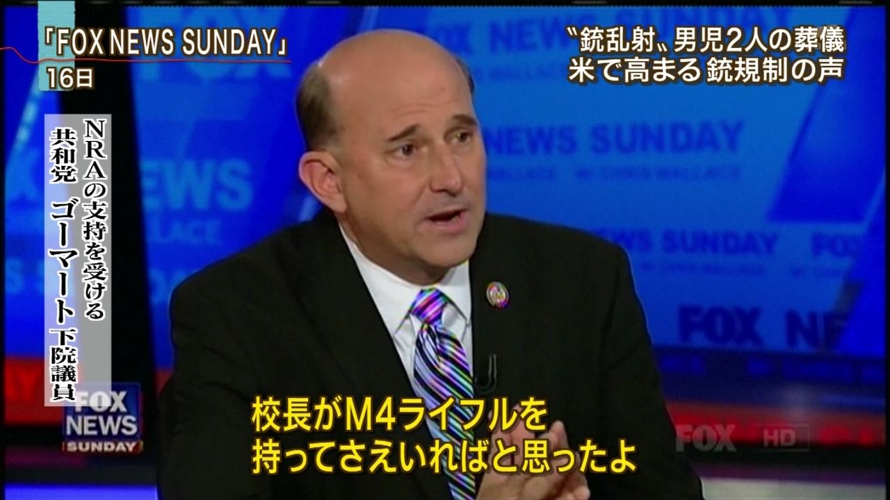 日本だとNRA(全米ライフル協会)から多額の資金援助を受けたこの画像の下院議員のようなイカレポンチはあまり知名度もないけれど、こういうNRAの族議員とも言える議員はアメリカには沢山いて本当にその顔を見ると虫唾が走る。画像はコラではないのだ。本当にこの議員はこういうことをニューステレビ番組で発言している。このクソッタレ議員は本気でこういうふざけたことを全米に向けて放送されると承知のニュース番組で言い放ったのだ。