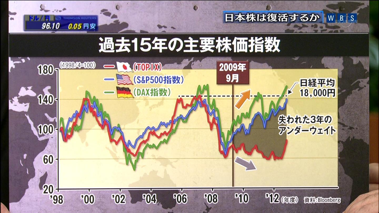 ミジンコが指摘するまでもなく散々嘆かれていた民主党政権発足からのTOPIXの流れ。麻生政権最後の月であった2009年8月、そうあの衆院選のときにTOPIXがリーマンショック以降やっと上昇気流に乗った気配がした。日本以外の市場はまさにそうだった。図にあるように米国もドイツもあの時から右肩上がりだ。ところが日本だけ失速した。民主党政権以外に理由が見当たらない。この民主党不況とも言える3年以上の歳月でいったい何万社が倒産したことだろうか?いったいいくつの町工場のかけがえのない技術が途絶えただろうか?グラフ(数字)は嘘をつかない。民主党の罪は重大だ。