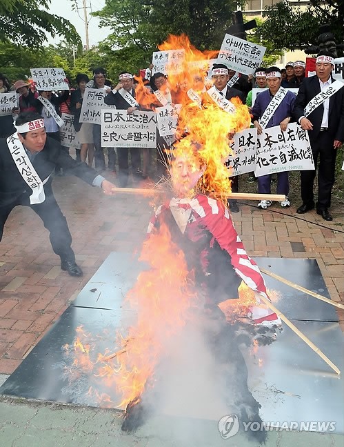 グリーンビジョンコリア蔚山本部(チョン・ソンファ会長)の会員約50名が蔚山市南区文化院前にて安倍総理のカカシと旭日昇天旗(←韓国ではそう呼ぶらしい)を火あぶりにしたんだとさ。同組織では「火刑式」と称しているんだけれど、こういう野蛮なことをする連中がこともあろうか「刑」などと称してなんの罪もないカカシと旗を燃やして悦に入っている姿はまさに異様そのもの。民度の低さはこういうところで出る。