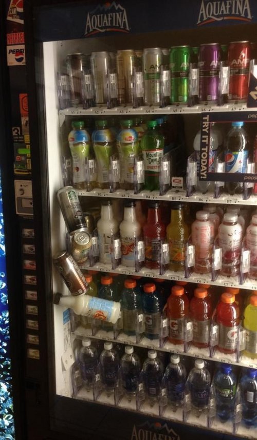 主に牛乳瓶や紙パックの飲料品の自販機であるのは、一本サイズの小さなカゴ(?)が注文のビンのとこまで迎えにいって、一本載せて取り出し口まで運ぶ、という形式なのでこんな状態にはならないですね。