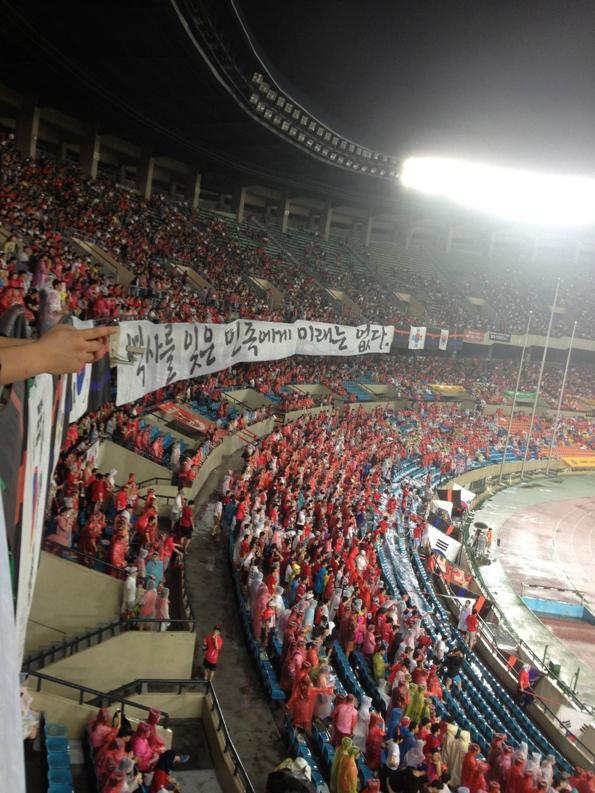 こうハングル語で書かれている。これがサッカーの国際試合の会場で掲げられたのだ。まだ韓国人には国際試合は早いということなのだろう。最低限の節度が伴っていない国民には国際試合で自分たちの民度の低さを露呈するだけの恥晒しの場にしかならない。歴史を忘れた民族か・・・・。う~ん、韓国人の場合は歴史を忘れたというよりも捏造していく内にその嘘を信じ込んでしまったというもっと酷いケースなので「忘れた」というわけではないのだろうが、この横断幕はまるで韓国人の自己紹介みたいだ。