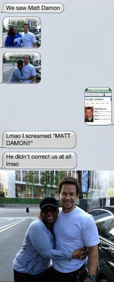 簡単に説明すると、この女性たちは俳優のマーク・ウォルバーグに出会ったときに「マット・デイモン!」と歓喜して一緒に記念撮影をして貰ったのだそうな。ところがマーク・ウォルバーグはその間違いを訂正することなく笑顔で写真に写ってくれたんだとさ。