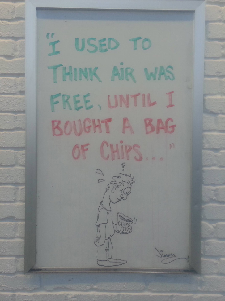 『ポテトチップスの袋の中身の空気の量に気がつくまでは空気は無料だと思っていたんだ。』
