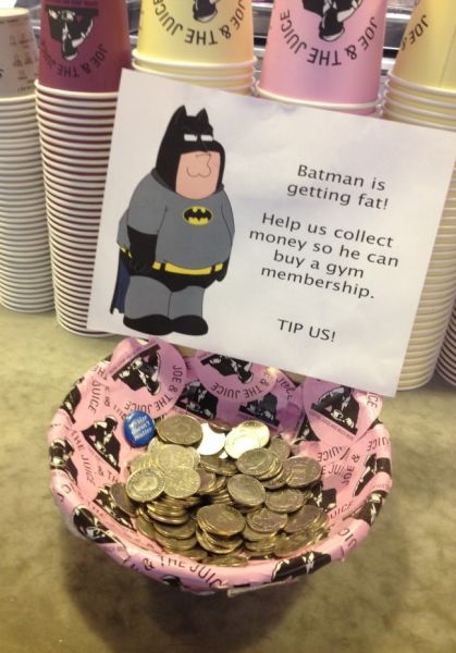 『バットマンが太ってしまいました。チップが集まれば彼はジムに入会できます。どうかご協力を!』