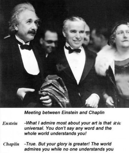 アインシュタイン「チャップリンさん、貴方の最も偉大なところはあなたの芸術が万国共通だということです。あなたは作品の中で一切言葉を発しないが世界中の誰もがあなたの伝えたいことを理解している!」