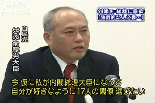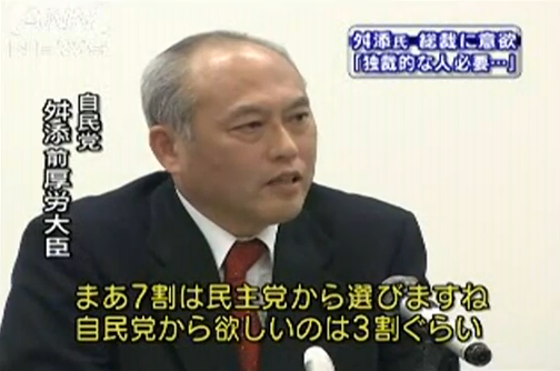 自分が総裁選に出たところで苦戦するような状況に陥っていたからといって自民党を逆恨みして自分が総理大臣になったら民主党から閣僚を7割も選びたいと述べるとは器が小さい。実際、この候補が総理大臣の可能性があったとは思えないが、仮に総理になっていたとして民主党から7割も閣僚を選んだ内閣がどういう事態になったのかは民主党政権を経験した今の日本人には容易に想像できることだろう。
