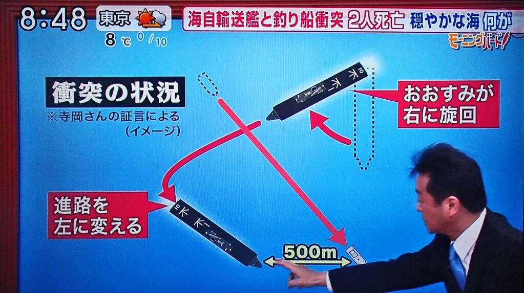 テレビ朝日の朝の情報番組での解説。あくまでも漁船に乗っていた目撃者の証言としてここまで詳しく図解しているその姿勢が卑怯だ。あくまでも目撃証言なので事実かどうかは分からないとした上でこうやって放送すればそれをそのまま信じてしまう視聴者たちだっていることだろうに。そういう信じてしまう視聴者狙いで放送したとしか思えない卑劣な行為だ。