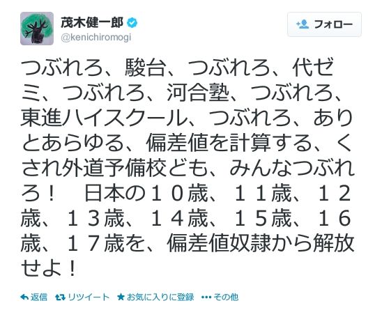 この脳を科学しているとかいう人物は「くされ外道予備校ども、みんなつぶれろ!」とツイートしているのだが漢字変換の少なさやその言動の過激さからして本当に正気とは思えない。ここまで酷いツイートだと、アルコールか薬物による異常行動に思えて仕方がない。