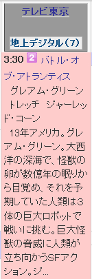 「バトル・オブ・アトランティス」が放送される。先々週のこの枠でちょっと昔の映画を観ていて「ダスティン・ホフマン、若いな~」とか言いつつ油断していたら次回の予告でコーヒーを噴いた。このテレビ欄の紹介だけ読むとまるでちゃんとしたSFアクション映画のように誤解されてしまうかもしれないが実際は当ブログのレビューの内容だ。