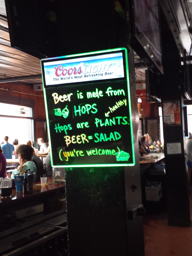 『ビールはホップから作られています。ホップは植物です。(←健康に良い)ビール=サラダです。』