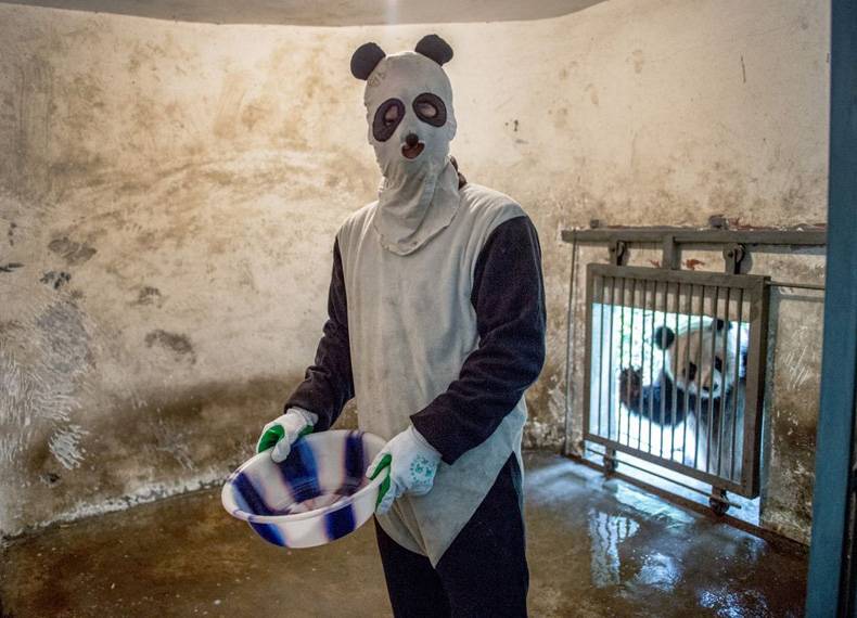 子供のパンダを野生に帰す為には人間に慣れさせないことが必要とのこと。その為にこういう恰好になるわけなのだが・・・・・が・・・・・う~ん・・・・・(-_-;)