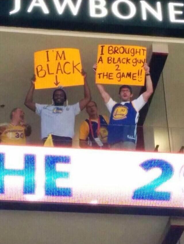 オーナーが人種差別発言で永久追放されたロサンゼルス・クリッパーズとゴールデンステート・ウォーリアーズの試合にて。ウォーリアーズの白人ファンが「黒人の友達を試合に連れてきたぜ」と書かれたプラカードを掲げ、隣の黒人ファンが「俺は黒人だ」と掲げている。