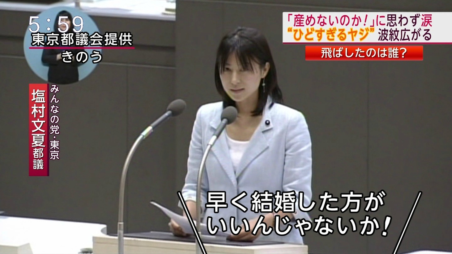 結婚はすれば良いというものでもなし、ただ同じ議会にいるというだけの初老の男性議員(←声からしてそう推測)の「早く結婚した方がいいんじゃないか」という野次は余計なお世話を通り越してハラスメントだ。「産めないのか」に至っては議論するまでもない。この野次で一発アウトということだ。つまり辞任しか有り得ない問題発言であり、野次を飛ばした議員が議員を続けたいのであっても1度議員辞職をして次の選挙で民意を問うべきことだ。議員は結婚をしていなかろうとも、出産経験がなくとも、他のどんな経験をしていなかろうとも政策を推進するべきなのだ。政治というものはなにかしらの政策に関わることの経験があるから適任とも言い切れず、その政策についての知識、計画立案・推進能力、そしてなによりも最後までその政策を突き進める情熱が大事だ。