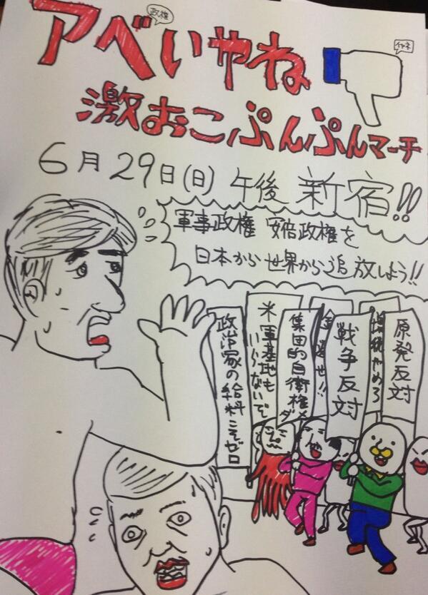 今の日本では集団的自衛権を反対する人々が猛威を振るっている。街中でとんでもない大音響でデモを行い、官邸周辺でもドンチャン騒ぎ、焼身自殺未遂現場では誰も死んでいないのに献花がいくつもされ、日本語のおかしな反対運動まで展開される始末。