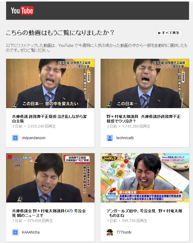 この後に続くオススメ動画もこの野々村県議の狂乱会見ばかり。この動画を余り長く見るとこちらまでおかしくなりそうで困る。