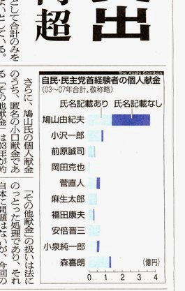鳩山代表:個人献金5.9億円、匿名が6割 友政懇関連(毎日jp)←匿名献金(5万円以下の献金)が6割ってのは余りにも不自然な割合だ。左図の党首経験者たちと比較しても鳩山由紀夫が受けている個人献金の額の多さとその割合の異常さが目立つ。