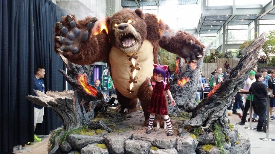 超有名なオンラインゲーム(日本語版が無いので日本ではそれほどプレイヤーはいない)のキャラクターの等身大フィギア。凶暴なクマのぬいぐるみが炎を操る女の子を守るんだけれど、このクマがとんでもなく凶暴。このクマを女の子が召喚したら敵プレイヤーたちは一斉に逃げ出す。