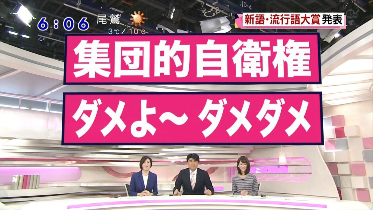 日本テレビの流行語大賞についての取り上げ方は以下のキャプ画像のとおり。キー局各社、大体こんな感じの取り上げ方だった。昨年はアベノミクスを流行語大賞には選出しなかった同賞がなぜに今回は「集団的自衛権」なる流行語だったとは到底思えない言葉を大賞に選出したのかはこの画像を見れば分かり易い。「集団的自衛権」に「ダメ」を付けたかったという浅薄かつ卑劣な思惑が透けて見える。