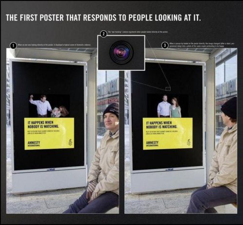 センサー内臓ポスター。ポスターを見ているときは暴力が振るわれない。