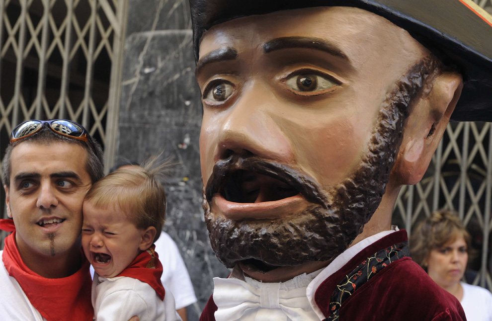 スペインの牛追い祭りにて。そりゃ子供が泣くわな。