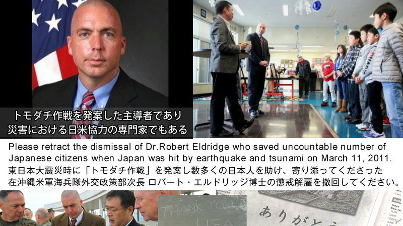 Dr. Eldridge was the original proposer of utilizing U.S. forces in a large-scale natural disaster in Japan, which was first carried out and called the “Tomodachi Operation” after the Tohoku Earthquake four years ago. Also, his fluent language skill helped greatly to better communication between Japanese defense forces and U.S. servicemen and servicewomen when they reconstructed the Sendai Airport shortly after the disaster. He has been promoting better relationships between Japan and the U.S. through his line of duty and many other occasions. Thus, he is highly respected by many Japanese. His dismissal under the current critical circumstances in Okinawa is not only a great loss but also detrimental to the relationship between the two nations. His dismissal is what those anti-U.S. base activists want and doesn't serve anything but their anti-U.S. purpose. We would sincerely appreciate it if you would reconsider his dismissal. We, Japanese, need him to have better understanding of the two nations, which is the utmost necessity for the security of the Asian Region.