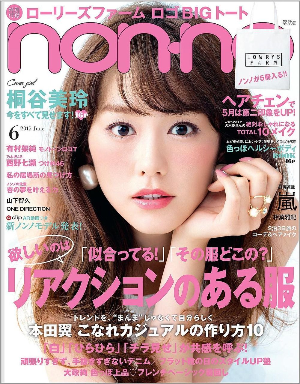 表紙は桐谷美玲。表紙に記載されている女性モデルの名前を見ると、表紙の桐谷美玲は勿論のこと、本田翼、大政絢、有村架純、西野七瀬の名前。・・・・西野七瀬?ああ、乃木坂46(AKBグループ)の子かと1度ため息。