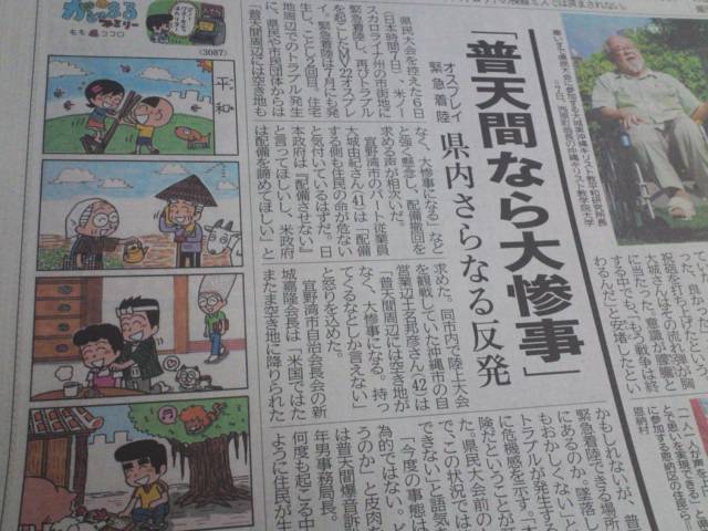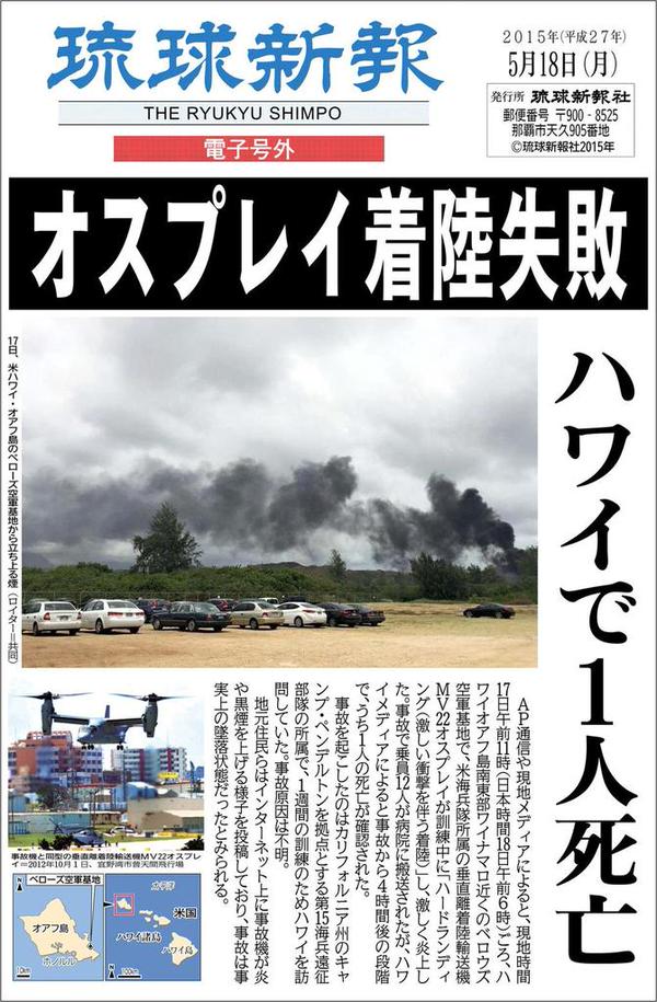 ここ数年で見ればアシアナ航空は最も危険な航空会社だろう。それでも日本の空も飛んでいる。民間機の多くはオスプレイよりも頻繁に事故を起こしているがそれでも日本の空も飛んでいる。それでもオスプレイだけが集中砲火となり、今回のような異様な号外発行だ。琉球新報はサンフランシスコ空港でのアシアナ航空の事故を号外で伝えただろうか?犠牲者数でいえばあの事故の方が今回のハワイでのオスプレイの事故よりも多く、しかも民間人の犠牲であるわけだがサンフランシスコ空港の事故について号外は発行しただろうか?
