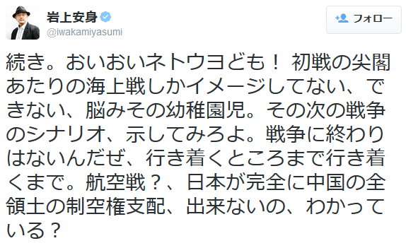 そもそもネトウヨという不確かな存在の有無を語りだすとキリがないので、ここでは岩上氏は「ネトウヨ=岩上氏を含めた左翼的な言動を叩く人々」と解釈することにする。そのネトウヨと岩上氏が総称する人々と、なんでか口論となったようで、これも不可思議なのだが「中国との全面戦争」を想定しての反論が上記のツイートのようだ。なんで日本が中国と戦争をしなきゃならないのかよく解らないところではあるが、ともかく岩上氏は「脳みその幼稚園児」と幼稚園児並みの罵声を織り込みながらも日本の自衛隊が中国全土の制空権をどうのこうの(アホくさ過ぎてこっちの脳みそがとろけそう・・・・)と語っているのである。