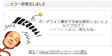 懐かしいですなぁ。ソフトバンクがヴォーダフォンを買収したので当時、信じられないくらいエラー続発だったYahoo!ブログを皮肉った画像。