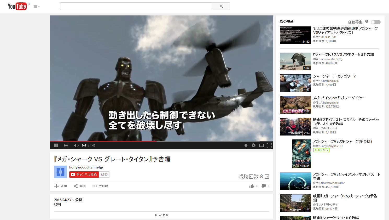 本日、『メガ・シャーク VS グレート・タイタン』予告編がYouTubeに公開された。ミジンコが数時間前に視聴した時には再生回数が8回だった。今確認したら14回に増えていた。